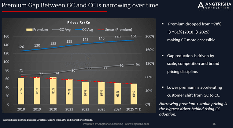 From ~78% premium in 2018 → ~61% in 2025, CC is now far more accessible.