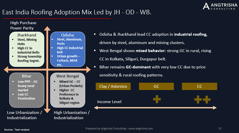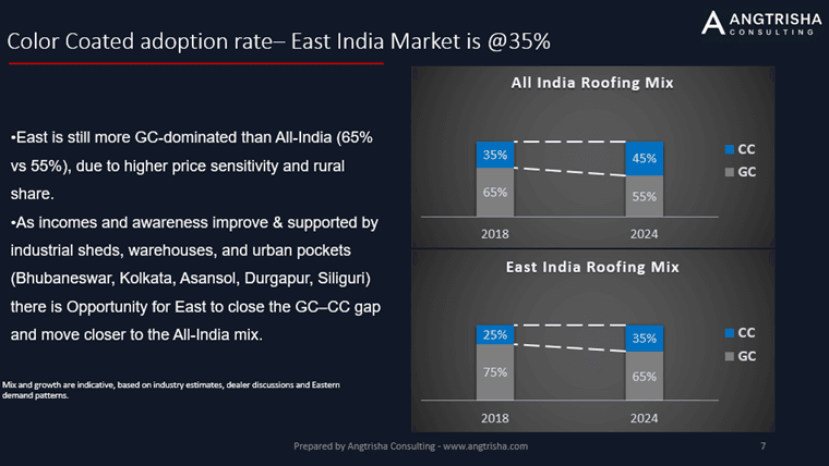 Today, East India’s roofing mix stands at 65% GC and ~35% CC, but this gap is narrowing. Districts with stronger industrialization, urbanization, and income growth — such as Kolkata, Siliguri, Asansol, Durgapur, Haldia, Kharagpur — are rapidly upgrading to Colour-Coated.