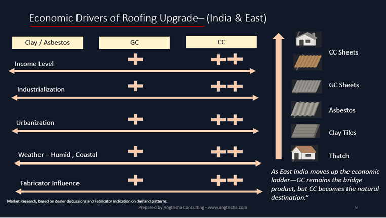 As income levels rise, buyers transition from Clay → Asbestos → GC → CC, with CC emerging as the final destination in both residential & institutional applications. Industrial belts have already completed this shift — warehouses, plants, and logistics hubs now prefer CC for reliability and long-term cost advantage.