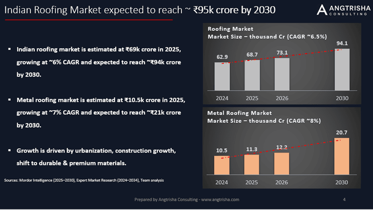 Between 2025 and 2030, India’s overall roofing market is expected to grow from ₹63,000 crore to ~₹94,000 crore, while metal roofing alone is projected to double during the same period. The shift is strongest in urban/industrial pockets, but semi-urban districts are catching up fast.